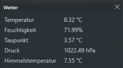 In den obigen Beispielen zu den angezeigten Werten kommt in N.I.N.A ein weiterer Wert vom Wärmesensor hinzu, der als Sky Temperatur angezeigt wird. Im LogMode oder im TerminalMode werden zwei weitere Werte angezeigt, weil der Wärmesensor nicht nur einen IR-Sensor (=Sky Temperatur) sondern auch einen integrierten TemperaturSensor an Bord hat.