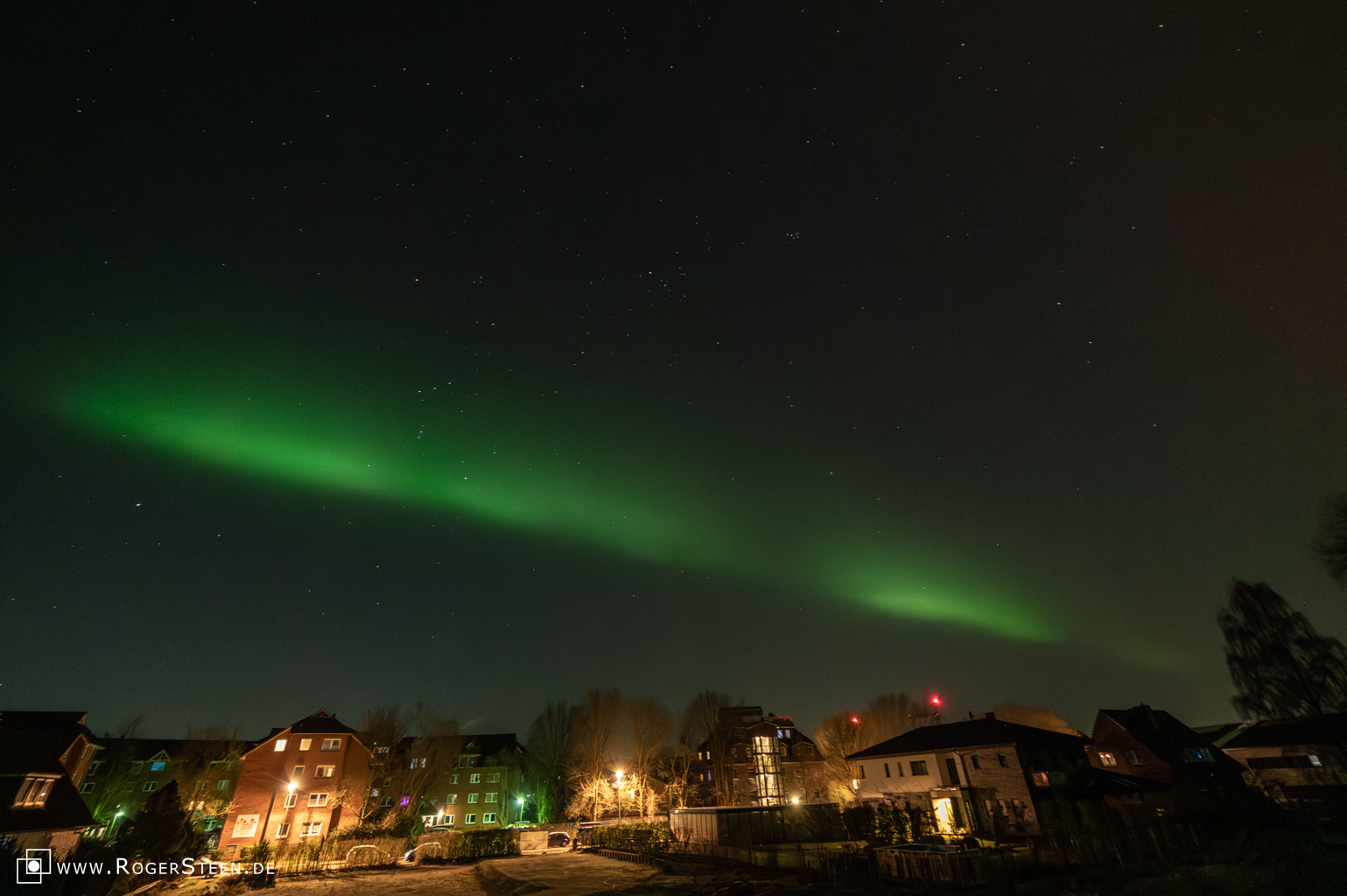 In der Nacht vom 26. Februar 2023 war von Buxtehude aus mit Blick nach Norden Polarlicht zu sehen. Man sieht das grünliche Leuchten am Horizont und etwas rötliches in der Bildmitte. Ich war an diesem Abend mit anderen Dingen beschäftigt und habe es leider viel zu spät gesehen. Am nächsten Tag gab es wieder Polarlichter, leider hatten wir eine geschlossene Wolkendecke.